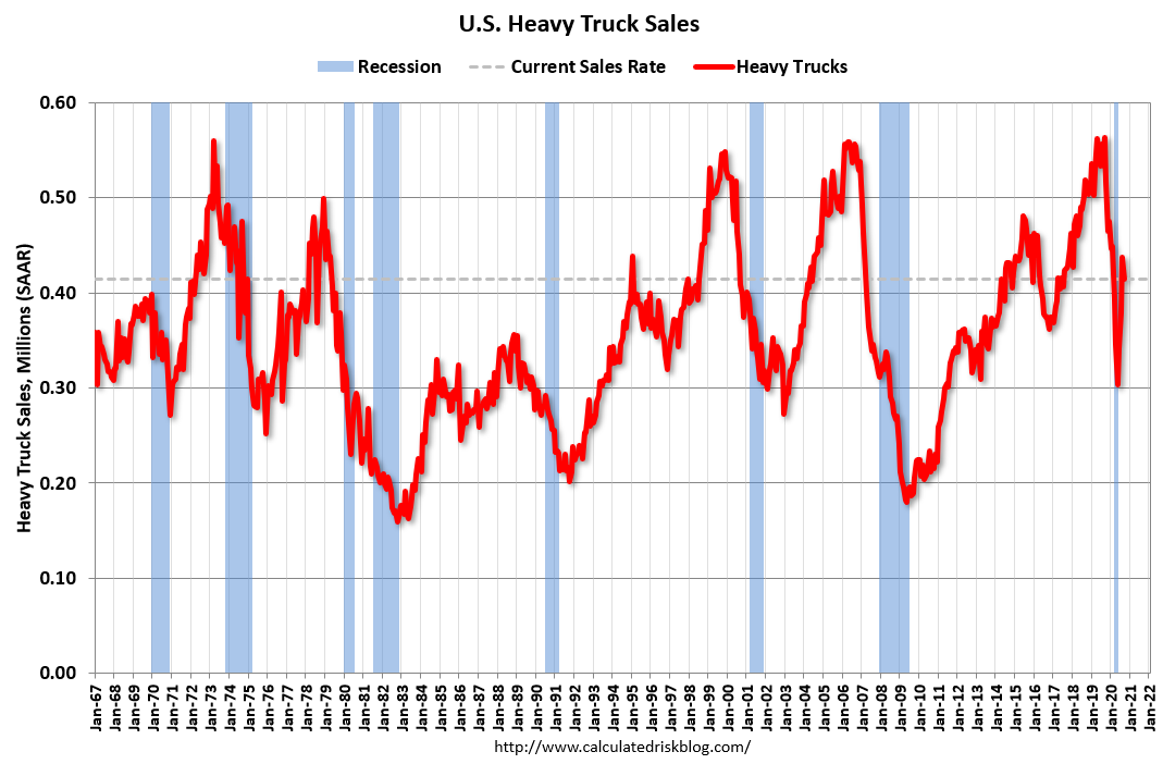 Heavy truck sales are now back to March 2020 levels, but still below February 2020 (pre-COVID).