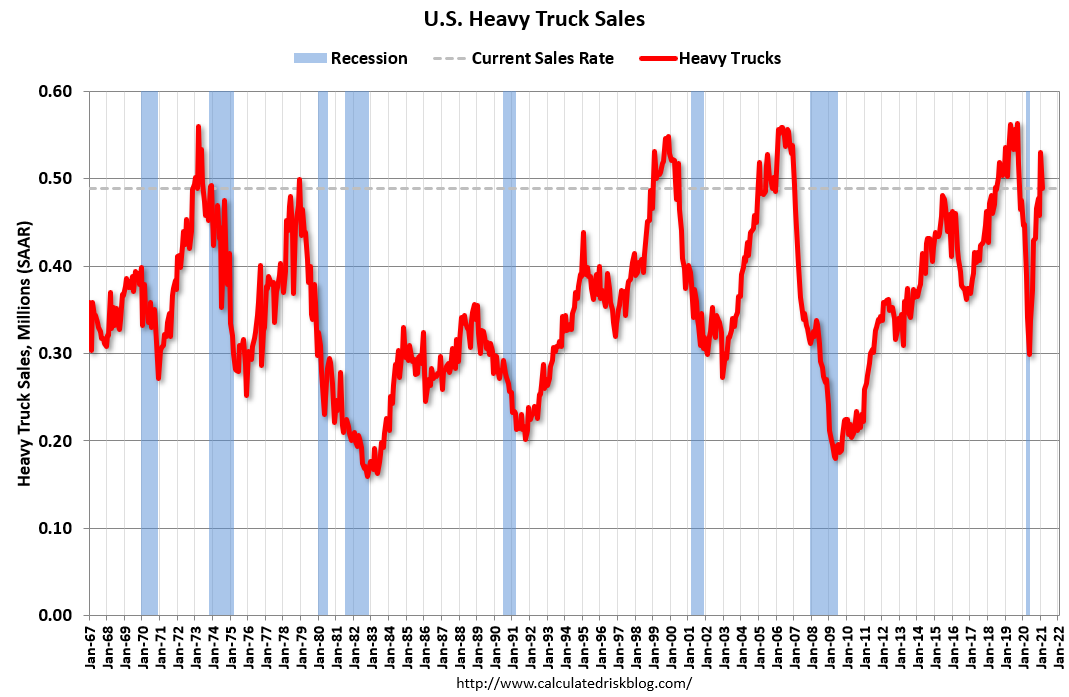 Heavy truck sales were at 489 thousand SAAR in February, down from 530 thousand SAAR in January, but up 9% from 448 thousand SAAR in February 2020.