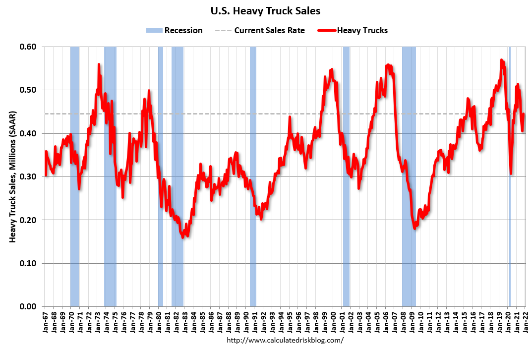 The third graph shows heavy truck sales since 1967 using data from the BEA. The dashed line is the October 2021 seasonally adjusted annual sales rate (SAAR).