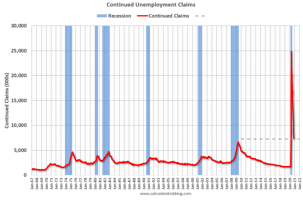 Note: There are an additional 9,332,610 receiving Pandemic Unemployment Assistance (PUA) that decreased from 10,324,779 the previous week (there are questions about these numbers). This is a special program for business owners, self-employed, independent contractors or gig workers not receiving other unemployment insurance.