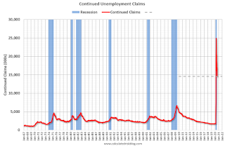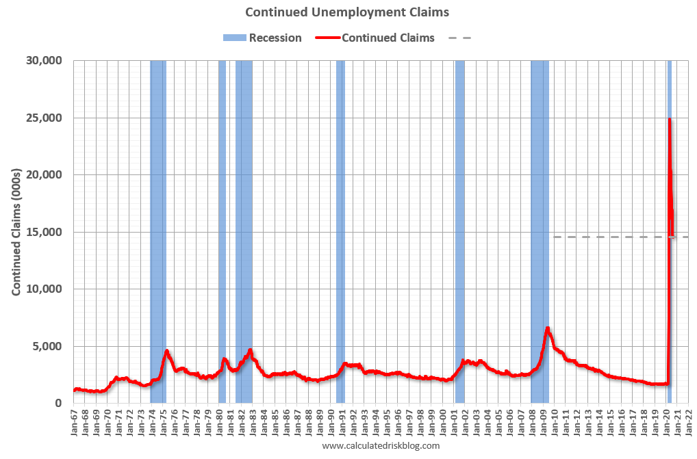Continued claims decreased to 14,535,000 (SA) from 14,758,000 (SA) last week and will likely stay at a high level until the crisis abates.