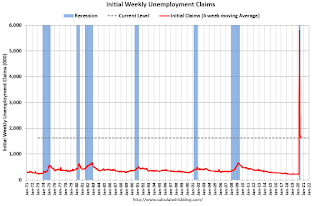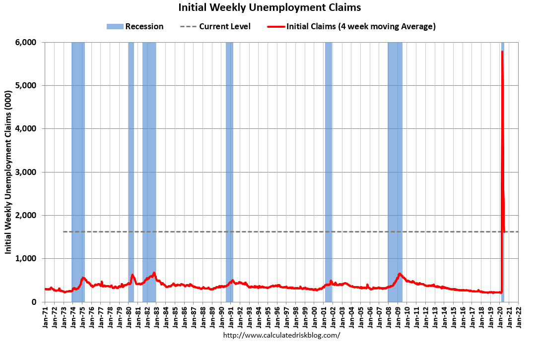 The dashed line on the graph is the current 4-week average. The four-week average of weekly unemployment claims decreased to 1,620,750.