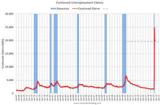Continued claims decreased to 19,522,000 (SA) from 20,289,000 (SA) last week and will likely stay at a high level until the crisis abates.