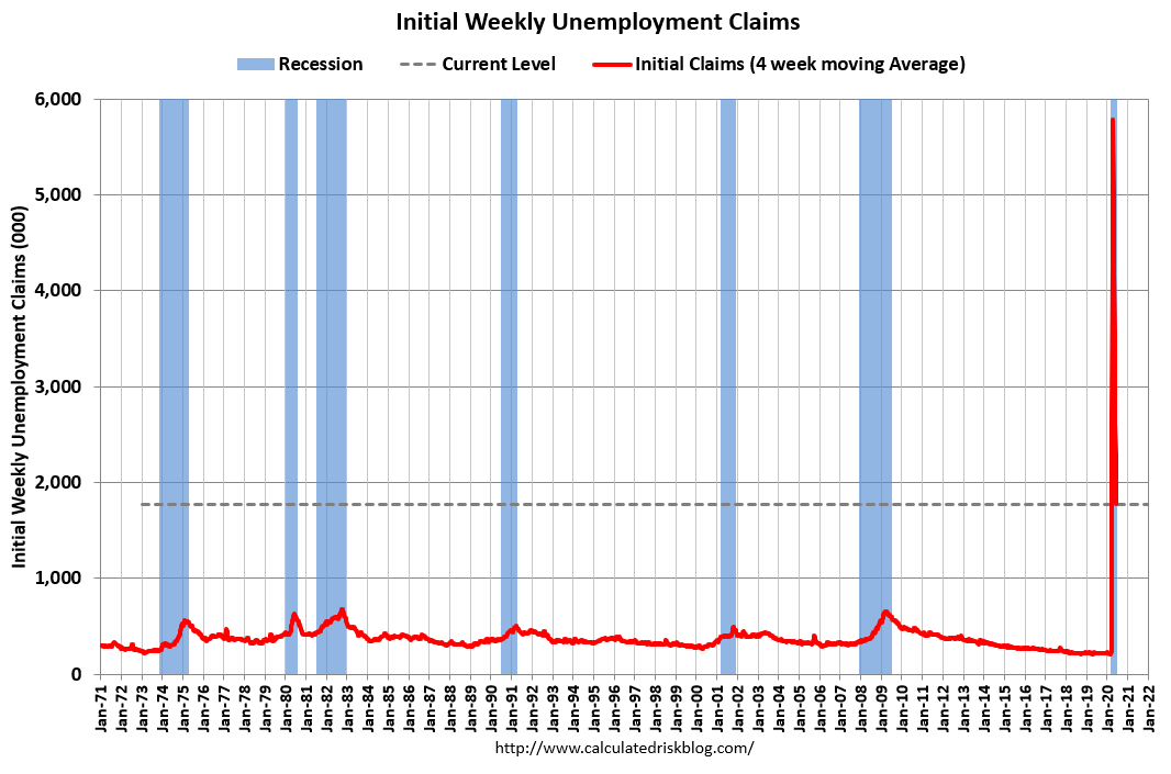 The following graph shows the 4-week moving average of weekly claims since 1971.