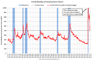 The dashed line on the graph is the current 4-week average. The four-week average of weekly unemployment claims decreased to 504,750.