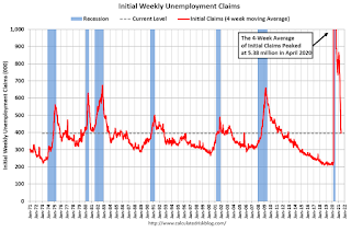 The dashed line on the graph is the current 4-week average. The four-week average of weekly unemployment claims decreased to 395,000.