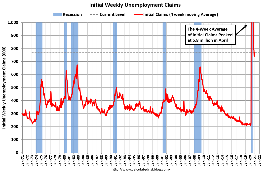 The following graph shows the 4-week moving average of weekly claims since 1971.