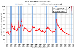The dashed line on the graph is the current 4-week average. The four-week average of weekly unemployment claims increased to 776,000.