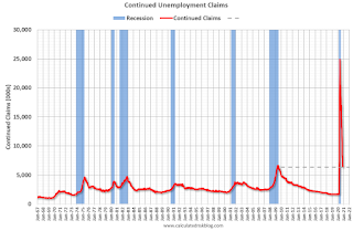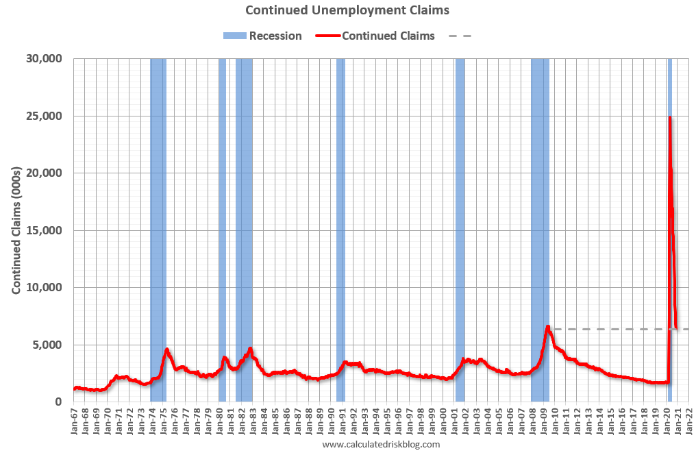 Note: There are an additional 8,681,647 receiving Pandemic Unemployment Assistance (PUA) that decreased from 9,433,127 the previous week (there are questions about these numbers). This is a special program for business owners, self-employed, independent contractors or gig workers not receiving other unemployment insurance.