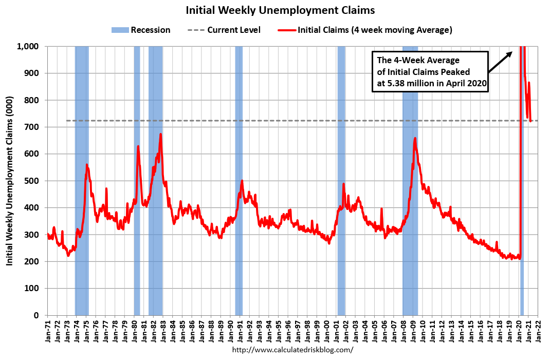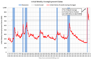 The dashed line on the graph is the current 4-week average. The four-week average of weekly unemployment claims increased to 723,750.