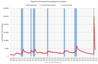Note: There are an additional 7,328,311 receiving Pandemic Unemployment Assistance (PUA) that decreased from 7,520,114 the previous week (there are questions about these numbers). This is a special program for business owners, self-employed, independent contractors or gig workers not receiving other unemployment insurance. And an additional 4,466,916 receiving Pandemic Emergency Unemployment Compensation (PEUC) down from 5,067,523.