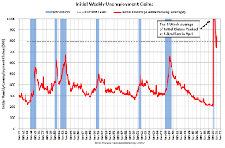 The dashed line on the graph is the current 4-week average. The four-week average of weekly unemployment claims decreased to 790,750.