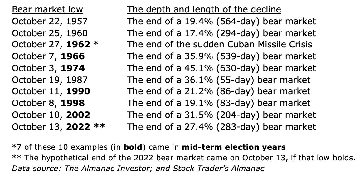 About a dozen post-World War II bear markets bottomed out during October, starting in 1946. The most recent bear market low may have come mid-morning on October 13, 2022. Some of the other October market bottoms have been: