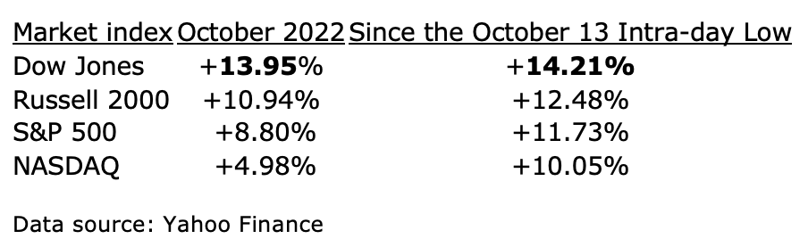 Was October 13 the low this year? So far, most major market indexes are up by double digits from the intra-day low set on October 13, 2022, so that may or may not be the bottom of the current slide, but the month of October certainly lived up to its recent reputation for stellar performance in the major indexes: