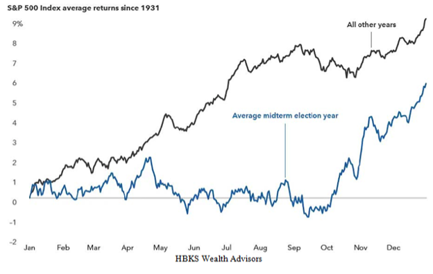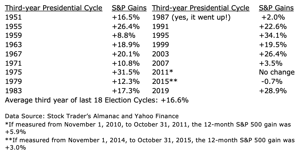 Not convinced yet? Consider this. Since 1950, there have been 18 mid-term elections, and stocks have gone up the following 12 months every time. Just looking at the third year of the four-year presidential cycle, 16 were up, with one flat year and one small loss, averaging +16.6% gains. Not bad.
