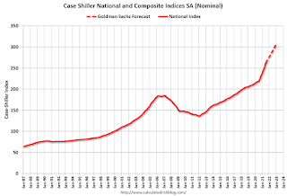 First, this is a projection for the end of next year. The most recent Case-Shiller report was for July, so this projection is for 17 months. This forecast is for an average of about 0.9% per month, well below the 1.5% per month average over the last year.Here is what the forecast would look like: