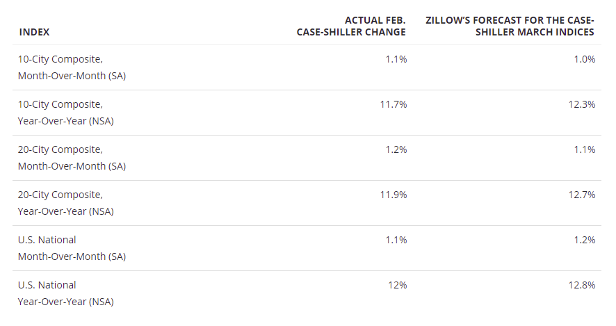 The Zillow forecast is for the year-over-year change for the Case-Shiller National index to be at 12.8% in March, up from 12.0% in February.