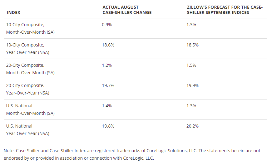 The Zillow forecast is for the year-over-year change for the Case-Shiller National index to be at 20.2% in September, up from 19.8% in August.